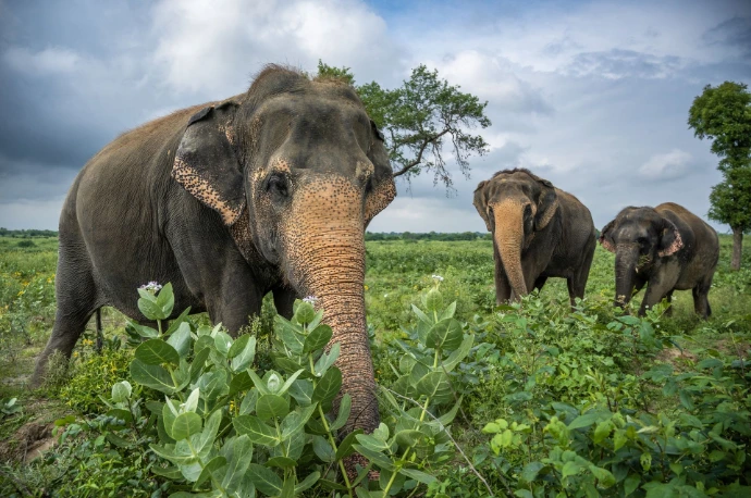 Observe elephants feeding, bathing, and interacting naturally